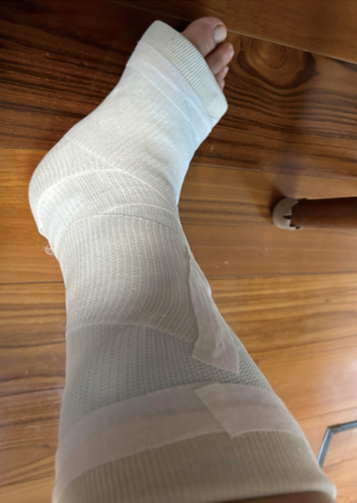それから直ぐ主人の運転で病院へ直行。そして出された診断が、(右足間接外果骨折)驚きと困惑もつかの間、医者と看護師の連携の良さを目の前にし、みるみる私の右足は団子の様なハムの様な形でギブスが巻かれていった。