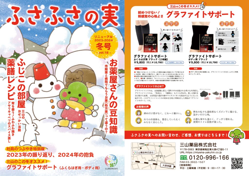 画像クリックで詳細を読むことができます(PDF) 2023-2024冬号ふさふさの実vol.18のラインナップはこちら! ふじこの部屋 三山薬品代表のスライ富士子がコラムを掲載しています。ぜひご覧ください。「三山のおせっかい活動」 薬膳レシピ 今回は”腎を養う...